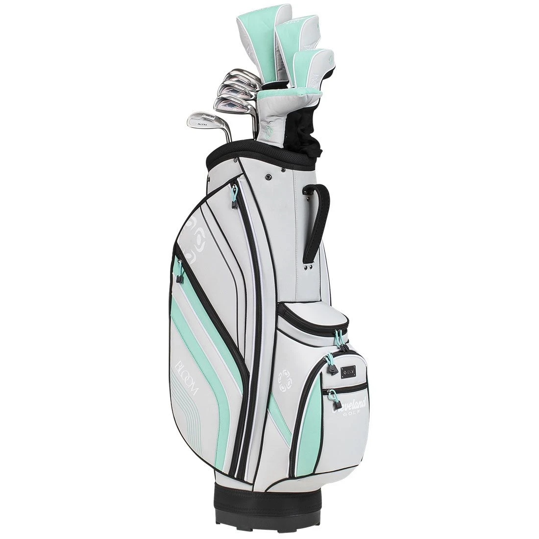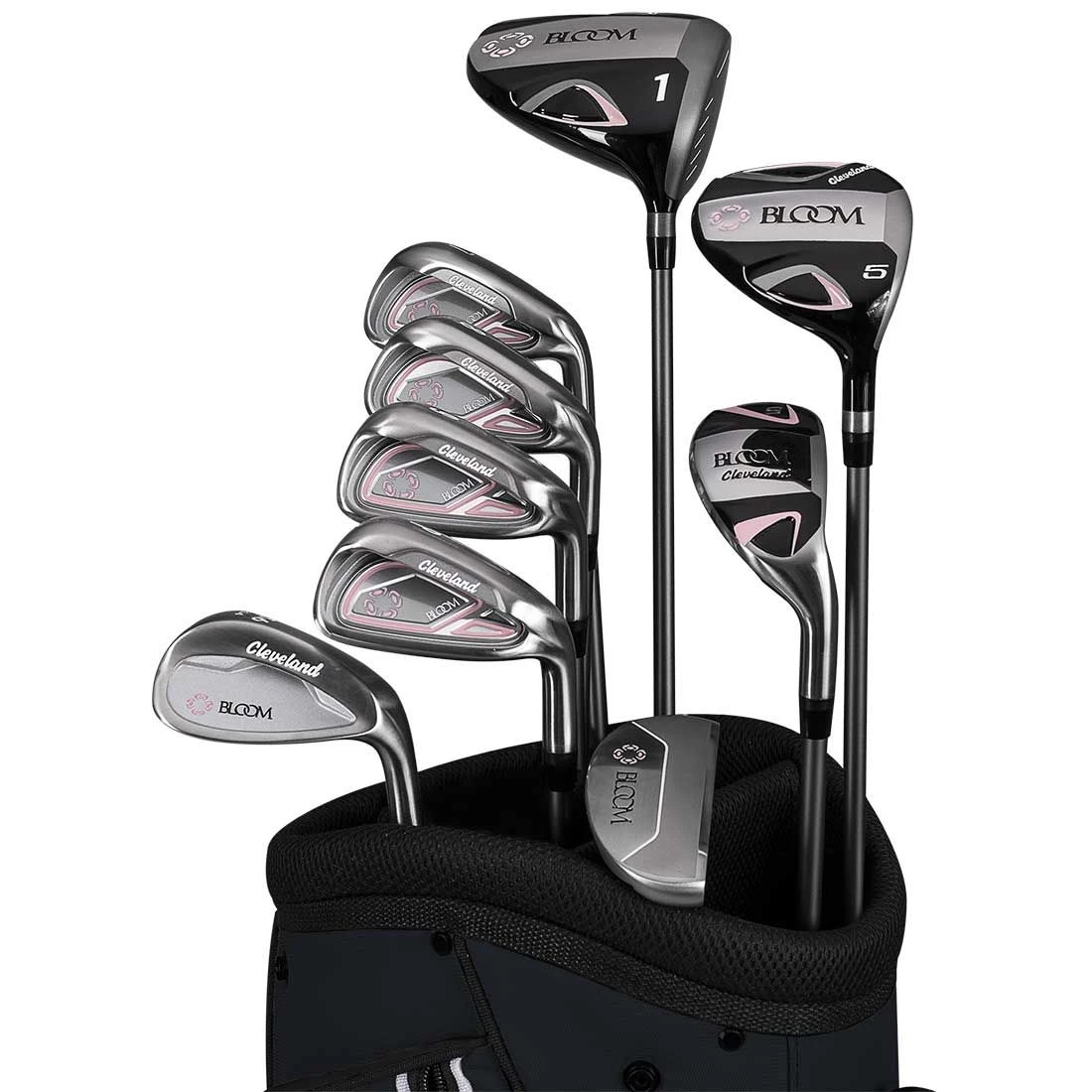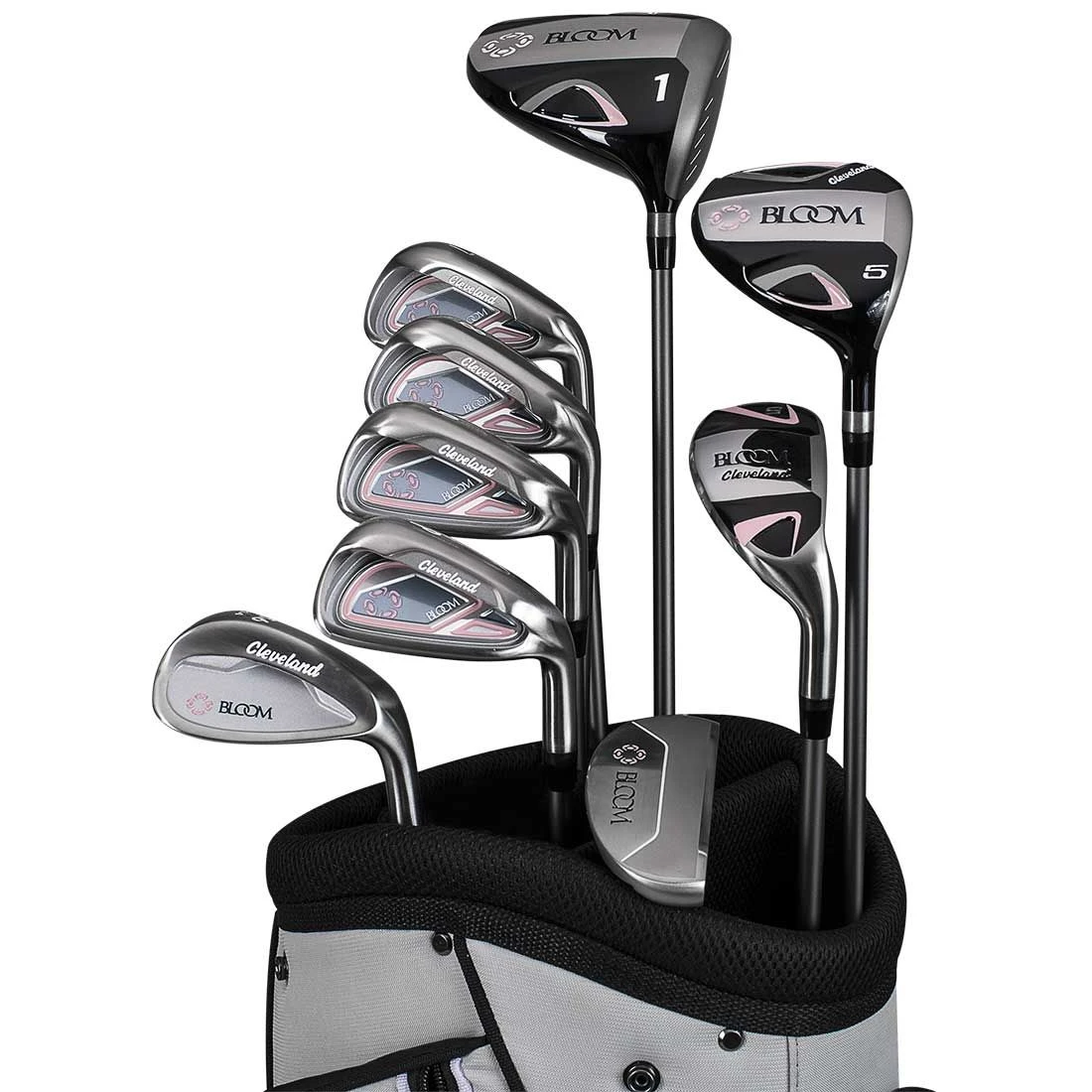 Perfect for beginners or intermediate golfers, the Women’s Bloom package set includes 8 lightweight clubs, a mallet putter, and a stylish 8-pocket cart bag.